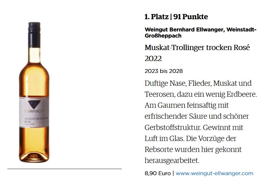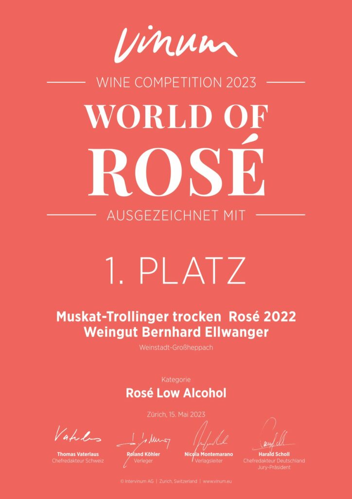 Geplaatst in: Rückblick door Yvonne Ellwanger op 16. Mai 2023 1. Platz VINUM „World of Rosé“ In der Kategorie „Rosé low alcohol“ hat unser 2022er Muskat-Trollinger Rosé trocken gewonnen!
