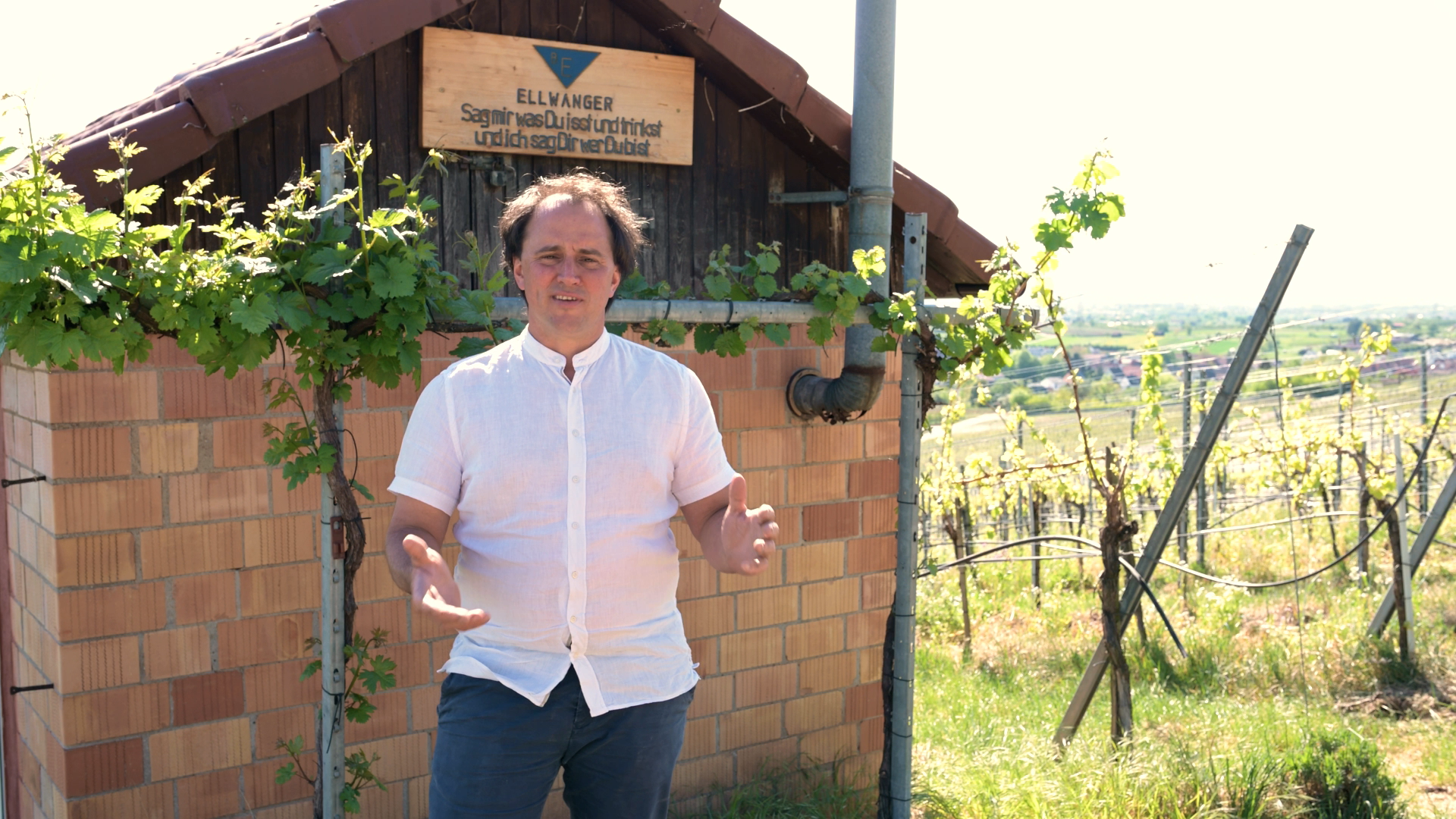 Sven erklärt direkt aus dem Weinberg das Terroir des Weinbergs sowie die aktuelle Vegetation und Arbeiten im Weinberg, Top-Sommelier Evangelos Pattas vom Restaurant Délice in Stuttgart verkostet professionell die Weine und gibt Speiseempfehlungen.