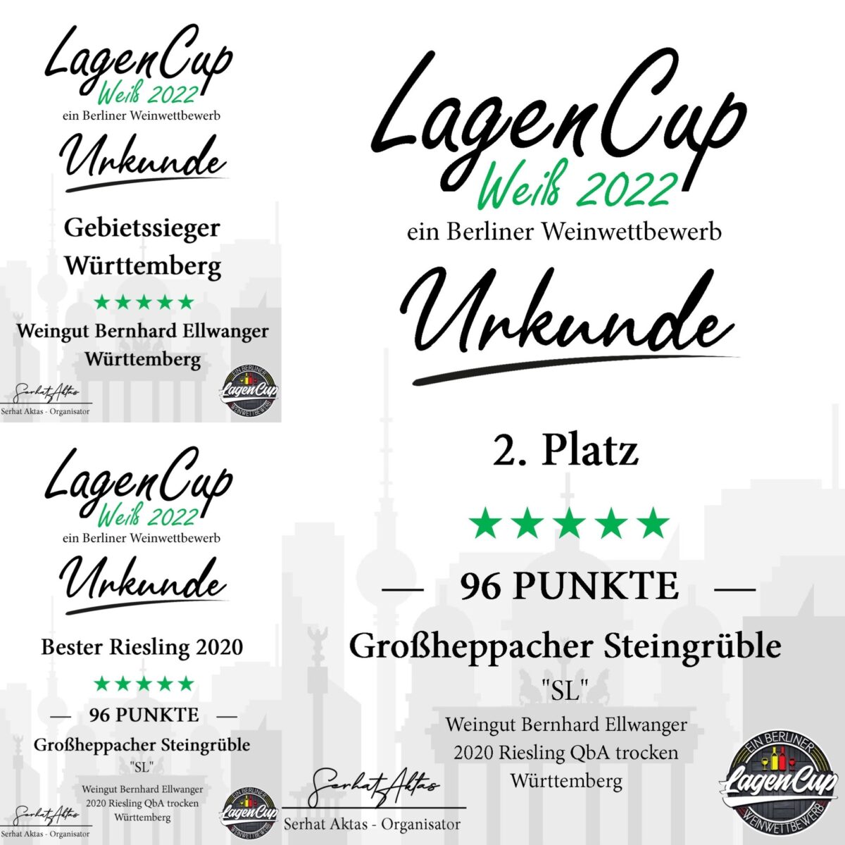 „…Wie man in der Blindverkostung merkt, sind auch die Ellwanger-Rieslinge nicht von schlechten Eltern. Oder in Worten eines Jurors „selten hatte ich so einen Riesling im Glas, bei dem ich dachte: dieser Wein ist für die Ewigkeit gemacht“. Natürlich ist das eine, durch sehr positive Emotionen, übertriebene Aussage, aber beim LagenCup ist das Reifepotenzial der Weine sehr wichtig. Und dieser Wein hat alles, was ein Spitzenwein zum perfekten Reifen braucht!“