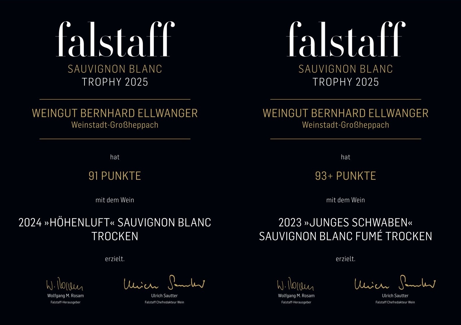 Bei der renommierten Falstaff Sauvignon Blanc Trophy konnten wir gleich zwei großartige Erfolge feiern: Unser 2024er Sauvignon Blanc Höhenluft überzeugte die Jury mit brillanten 90 Punkten, währen unser 2023er Fumé Blanc Sauvignon Blanc „Junges Schwaben“ mit herausragenden 93+ Punkten zu den Spitzenweinen der Verkostung zählt. Diese Auszeichnungen sind eine wunderbare Bestätigung für unsere Leidenschaft, unser Handwerk und die einzigartige Qualität unserer Lagen im Remstal.