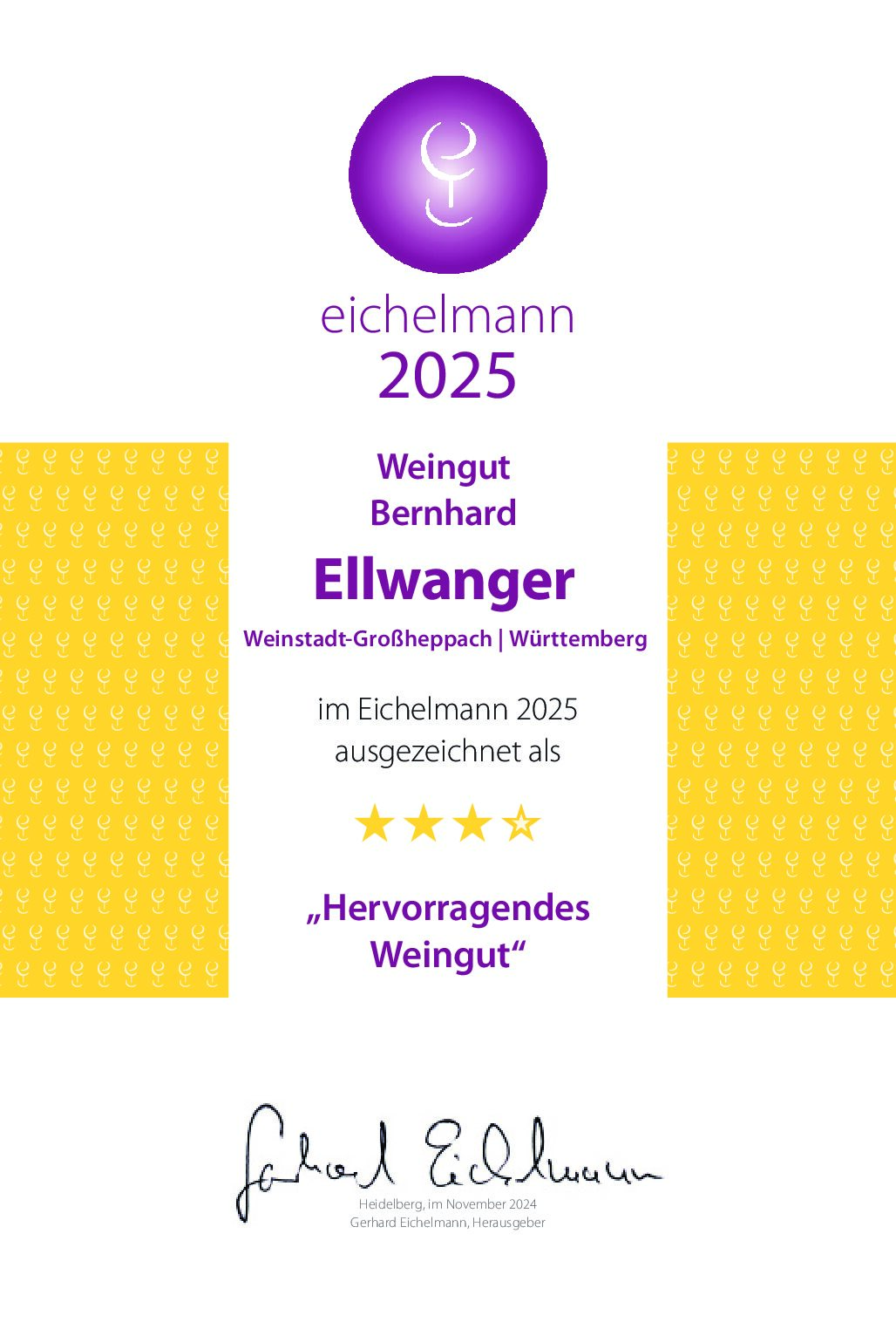 Das Weingut Bernhard Ellwanger wurde im Eichelmann 2025 – Deutschlands Weine mit 3,5 Sternen als „Hervorragendes Weingut“ ausgezeichnet.