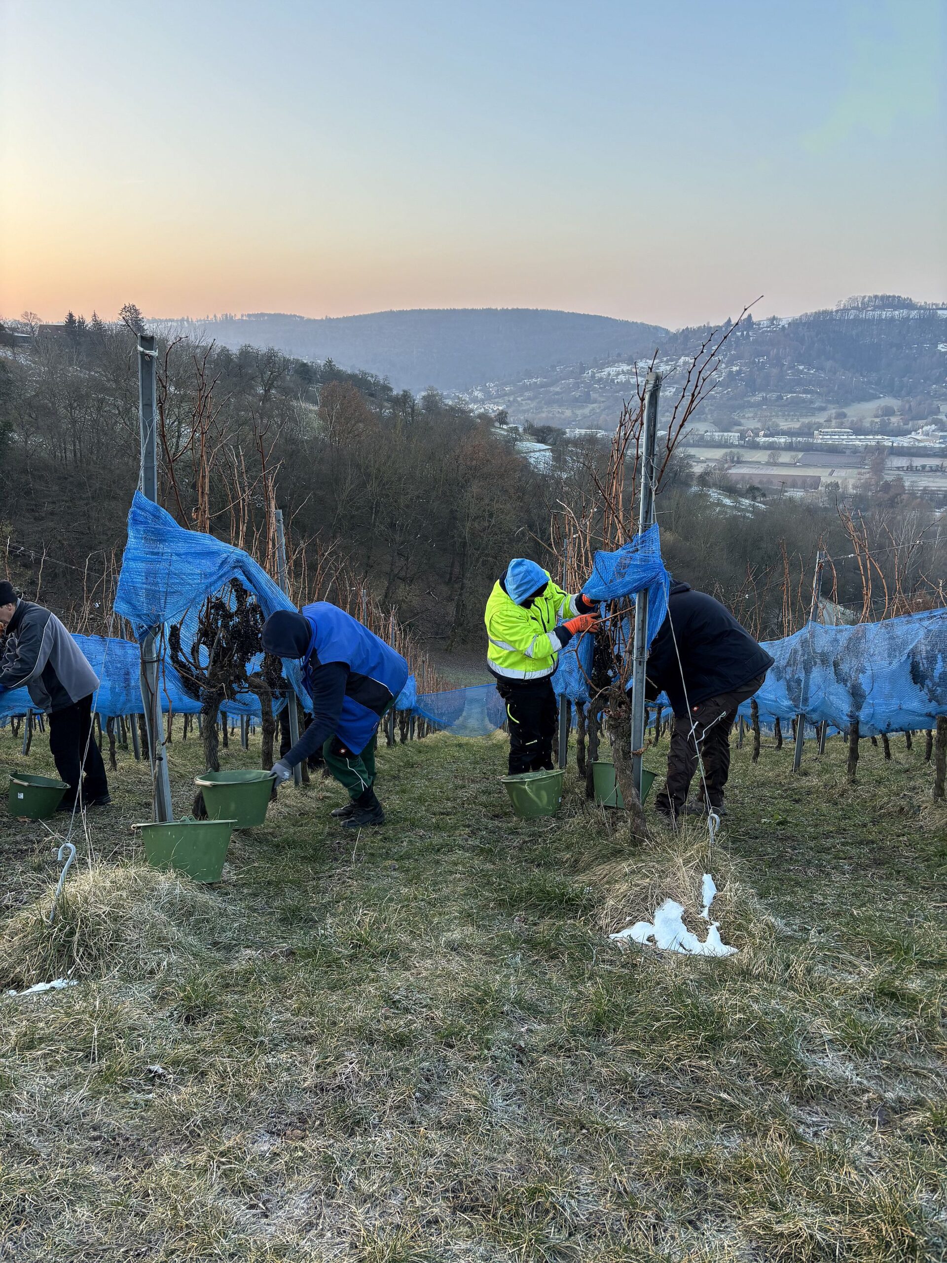 Bei -7,5 Grad konnten wir am Geradstettener Lichtenberg Eiswein lesen. Die Cabernet Cubin Trauben waren eingenetzt und die Trauben durch die dicke Beerenhaut noch sehr gesund. Super zufrieden sind wir mit dem Ergebnis: 150 Liter Cabernet Cubin Eiswein mit 140°Oechsle, der im Mai als „Die kleine Eiszeit“ in den Verkauf kommt. Auch wenn der Eiswein erst 2025 gelesen wurde, ist der offizielle Jahrgang 2024.