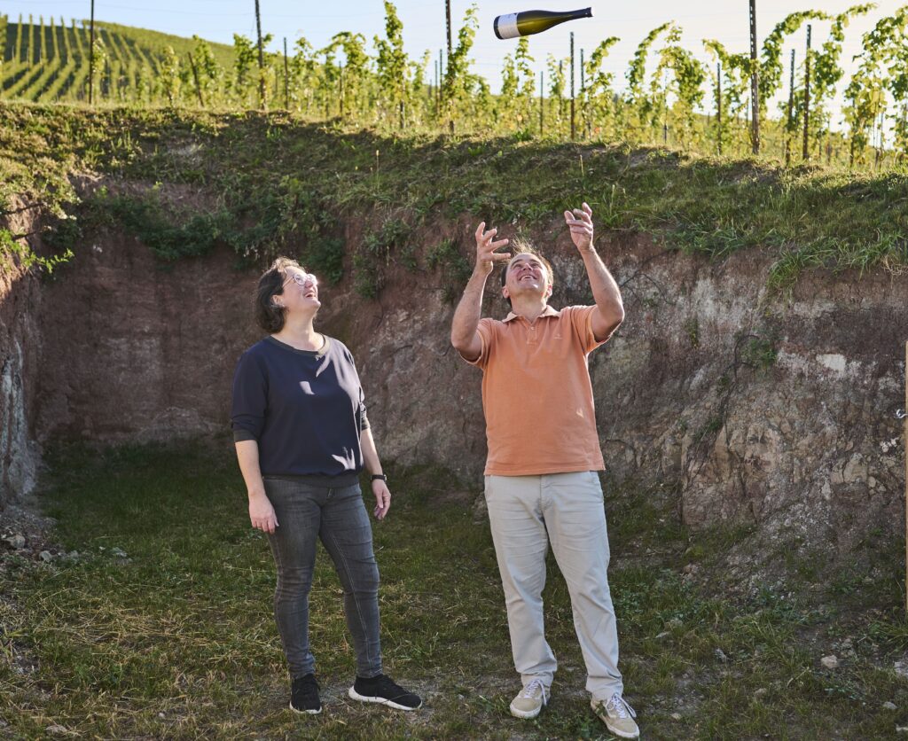 Durch eine eingegrabene Schneise in den Berg kann man hier eindrucksvoll die verschiedenen Bodenschichten betrachten. Eine Informationstafel erklärt über verschiedene Geografische Karten die Bodenschichten und das Terroir sowie den Zusammenhang von Stein und Wein.