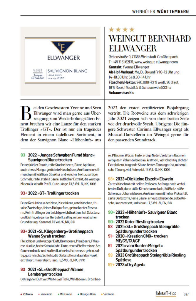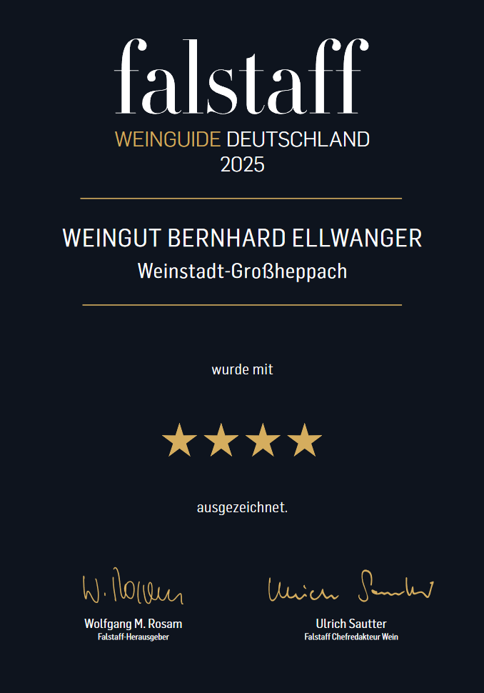 Mit 4 Sternen wurde das Weingut Bernhard Ellwanger vom Falstaff als „ausgezeichnetes“ Weingut geehrt. Wir freuen uns über diese Auszeichnung.