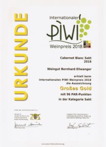 Großes Gold beim PIWI-Weinpreis 2018 für unseren 2016er Cabernet Blanc Sekt brut! Urkundenübergabe mit Minister Hauck und der deutschen Weinkönigin Carolin Klöckner.