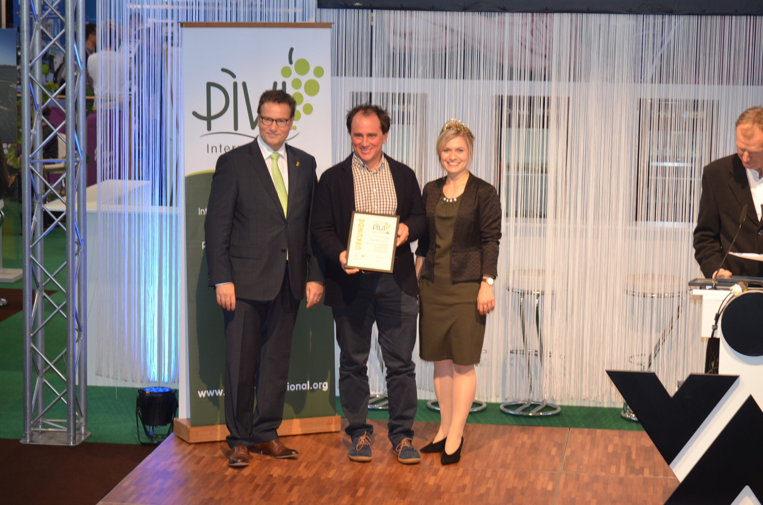 Großes Gold beim PIWI-Weinpreis 2018 für unseren 2016er Cabernet Blanc Sekt brut! Urkundenübergabe mit Minister Hauck und der deutschen Weinkönigin Carolin Klöckner.