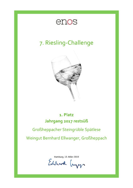 1. Platz für unsere 2017er Riesling Spätlese bei der enos-Riesling-Challenge 2019