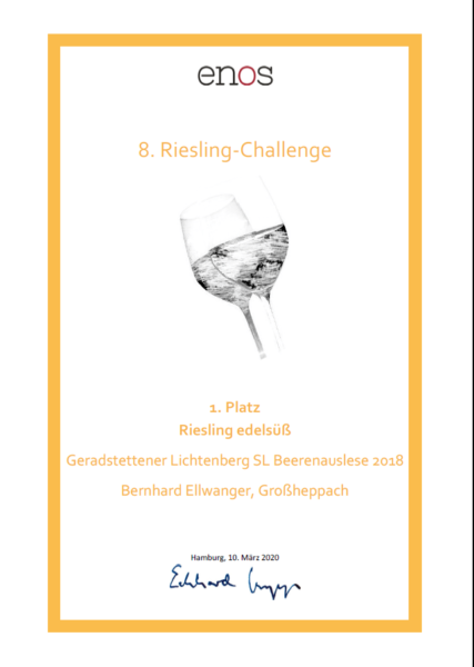 Wir freuen uns riesig über den 1. Platz für unsere 2018er Riesling Beerenauslese bei der Riesling-Challeng edelsüß und auch über einen Platz in den Top Ten für unseren 2016er Spätburgunder SL!