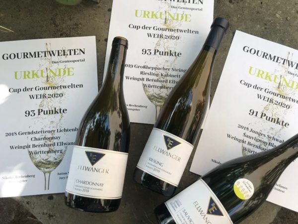 Beim Cup der Gourmetwelten im Juli 2020 kamen gleich 3 unserer Weine in die Top Ten: 2018er Chardonnay, Geradstettener Lichtenberg in der Kategorie „Burgunder-Familie & Co“2019er Riesling Kabinett, Großheppacher Steingrüble in der Kategorie „Kabinett-Cup“ und2018er Sauvignon blanc „Junges Schwaben“ Fumé blanc in der Kategorie „Aroma-Sorten“