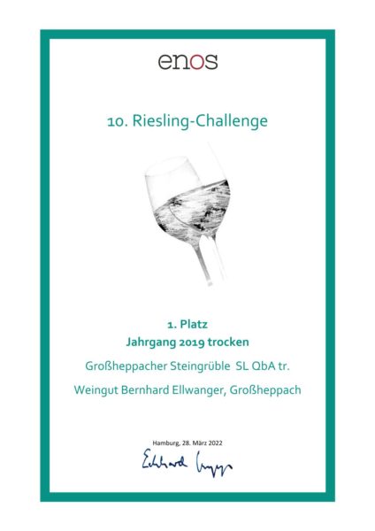 für unseren 2019er Riesling „SL“ trocken vom Großheppacher Steingrüble bei der enos-Riesling-Challenge