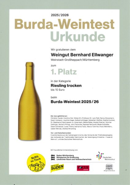 für unseren 2023er Riesling Kabinett feinherb vom Großheppacher Steingrüble Best of Riesling 2024 Im Rahmen einer feierlichen Preisverleihung wurden die besten Rieslinge des diesjährigen Wettbewerbs ausgezeichnet. Schirmherrin Ministerin Daniela Schmitt gratuliert persönlich den erfolgreichen Winzern. Fast drei Wochen dauerte die intensive Verkostung der zu Meiningers Best of Riesling 2024 von Weingütern aus der ganzen Welt … Weiterlesen