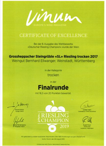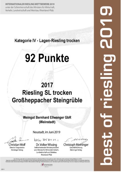 Super abgeschnitten hat unsere Riesling-Kollektion bei „best of riesling“ 2019: Unser Riesling „SL“ war im Finale (92 Punkte), besonders freuen wir uns für unseren 2018er Riesling Kabinett vom Großheppacher Steingrüble mit tollen 90 Punkten. Und auch unser Riesling *Oberholz* vom Geradstettener Lichtenberg hat mit 89 Punkten sehr erfolgreich abgeschnitten 🙂