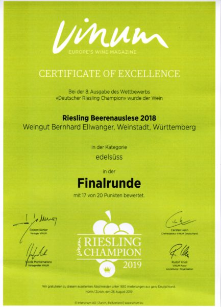 17 Punkte für unsere 2018er Riesling Beerenauslese vom Geradstettener Lichtenberg und 16,5 Punkte für unsere trockenen Riesling „SL“ vom Großheppacher Steingrüble 🙂