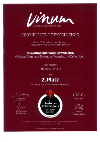 2. Platz beim Deutschen Rotweinpreis 2017 in der Kategorie Edelsüß für unseren 2016er Muskat-Trollinger Rosé Eiswein